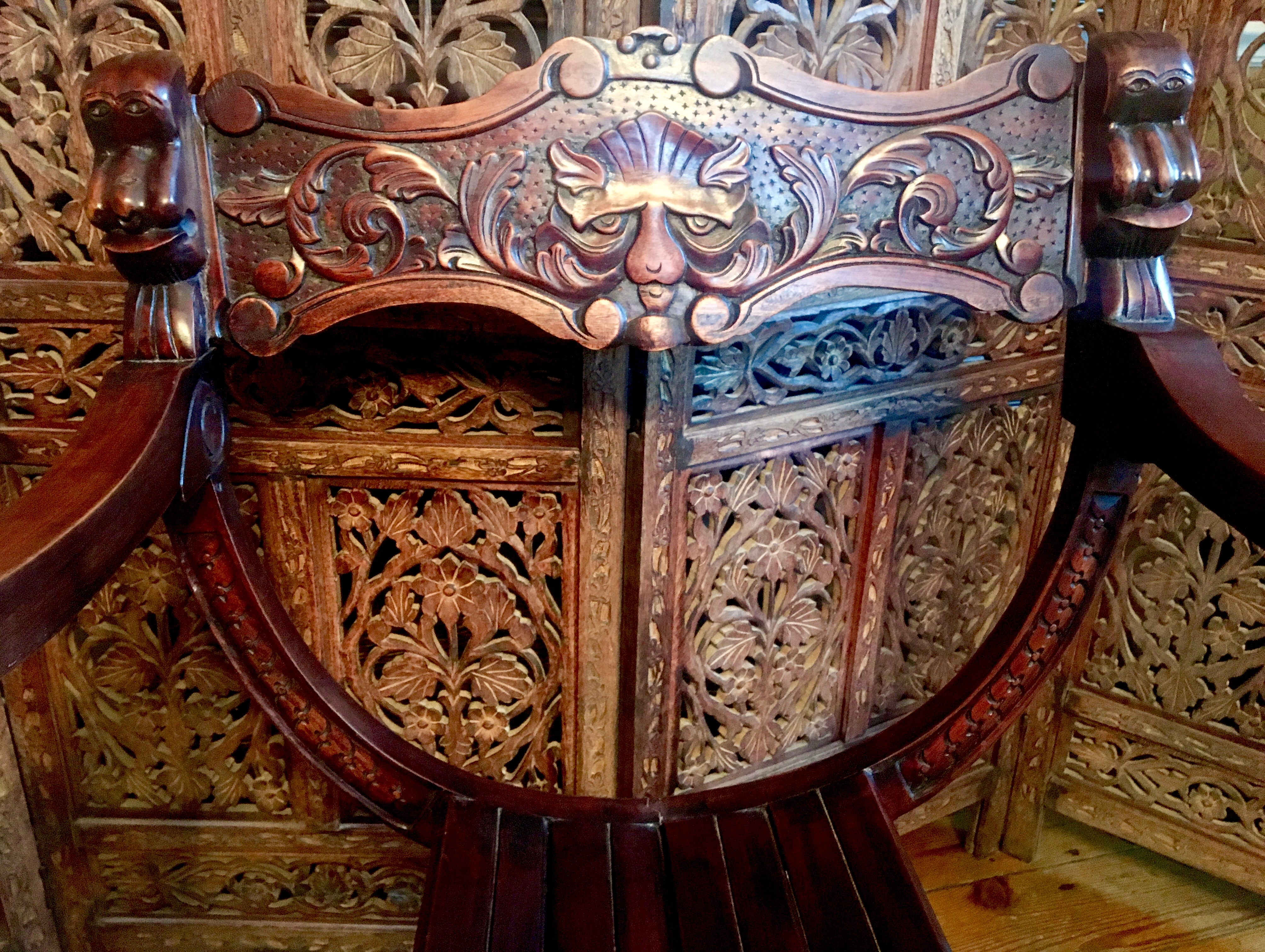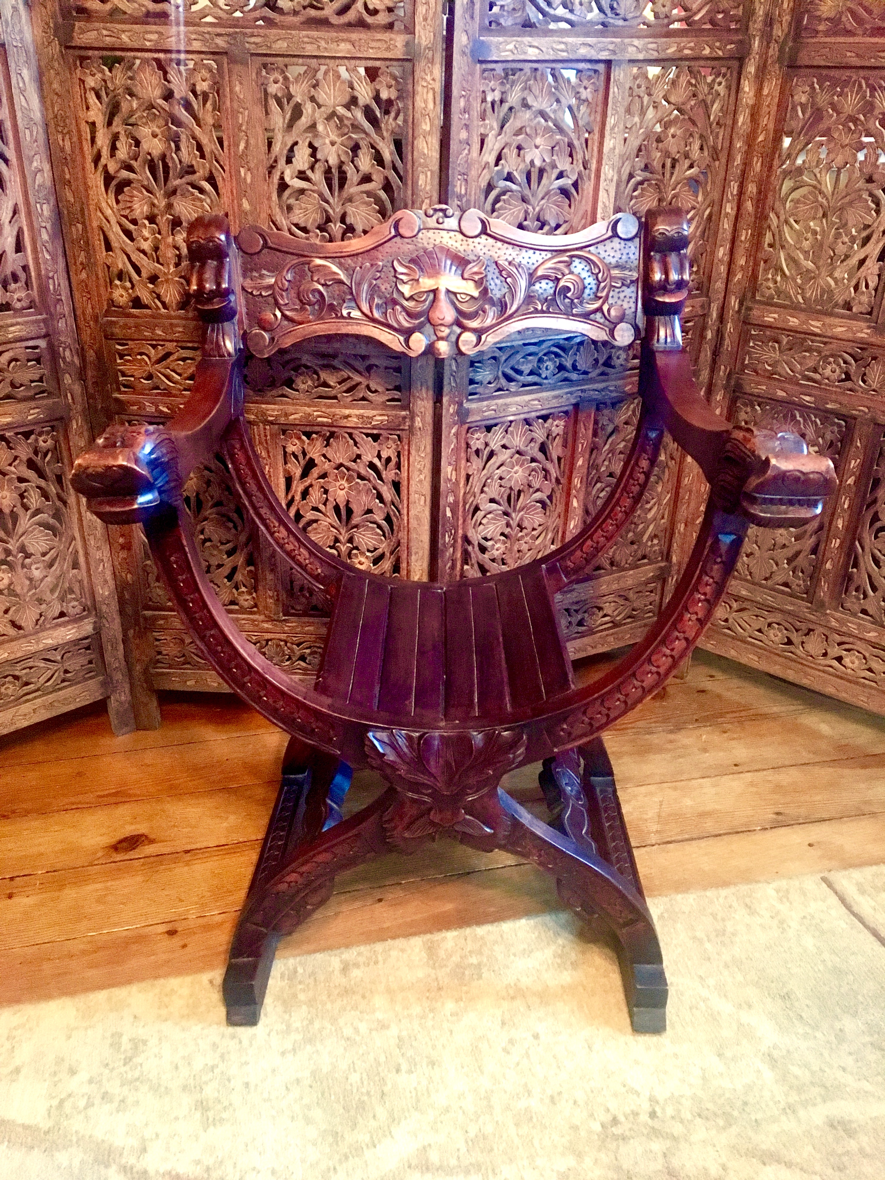 One of my ongoing quests has been to find more period chairs. This week I hit the jackpot. I monitor many online sites that sell second hand antiques (various Facebook marketplaces, eBay, craigslist and so forth). Early in the week, I hit upon a woman selling off all the furniture in her house to prepare for a move. She has something for sale that she was calling “antique chair”. I’d call it a Dantesca– a curule type chair similar to a Savonarola but with only an x-shape on the front and back rather than the many you see on Savonarola. It has beautiful carving (in fact the carving on the back piece kind of looks like Grumpy Cat to me). Jeff picked it up on Thursday, and, if we had only found the Dantesca this week, it still would have been a success.