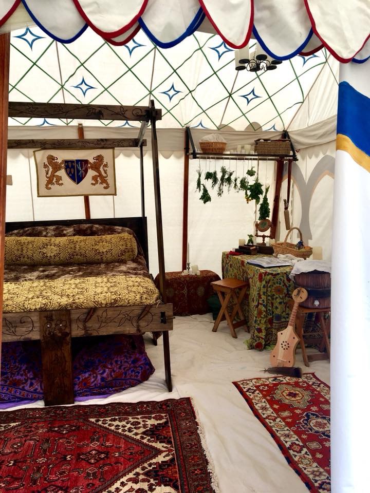 As some may know, in the mundane world I make my living as a theatrical set designer. This means I have a keen need to create beautiful, immersive environments– especially when we are escaping the modern world for two weeks to attend Pennsic. Our encampment is a mix of more historical pieces we built ourselves (some for function over form), antiques that I have collected that “feel in the world,” and modern pieces that can at least camouflage into our medieval campsite.