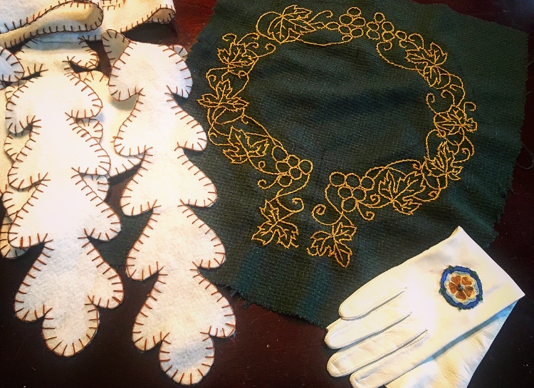 Emeline, just finished up two projects today. She has been working on the neckline for a new gown as well as tacking down her Queen’s Order of Courtesy rose to the white leather glove. The actual rose was embroidered beautifully by Mistress Jehannine de Flandres, but at the time Emeline received the award, there were not any gloves to give her (the embroidery was on a linen placeholder). Emeline was so excited to add it to the glove and hopefully wear it at Kings and Queen’s Bardic this weekend.