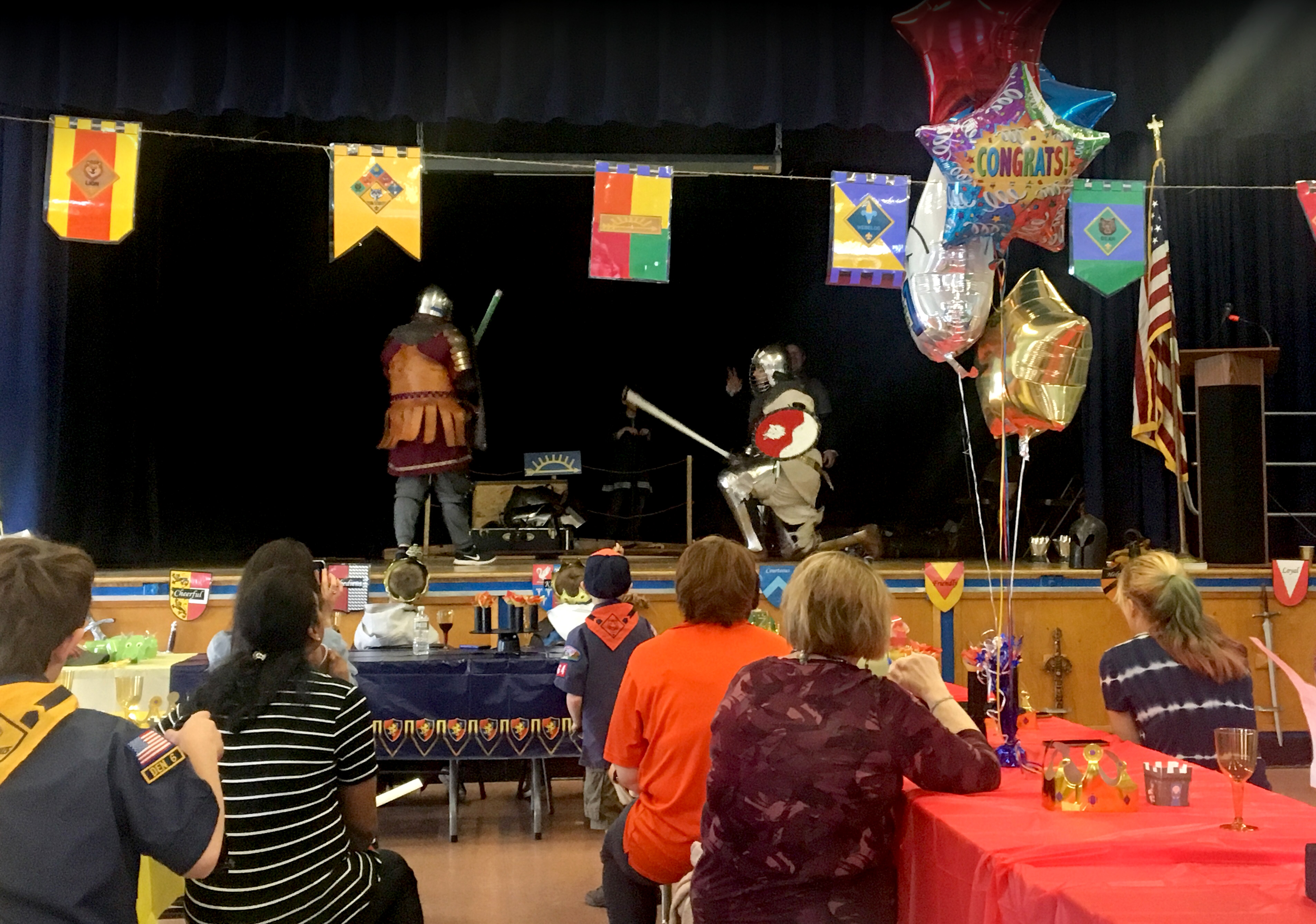 Lastly, in regard to Chatelaine-type projects– today we hosted a demo! While many in our Barony were celebrating the Coronation of new Royals, a few of us had the distinct pleasure to celebrate while spending the afternoon with the “Killer Coyotes” Cub Scout group as they “Partied like it’s 1399” for their Blue and Gold Dinner. Thank you to all who made this demo so special! Their Excellencies Jonathan and Teresa (and Oskar), Master Orlando Sforza, my husband, Phelippe, and Jonathan’s Man-at-Arms, Alex. Master Orlando led an amazing demo on the evolution of armor and weapons (with some very exciting details and fighting from his Excellency). Baroness Teresa shown as she taught the kids about heraldry. It was all very exciting and we really had an amazing time!