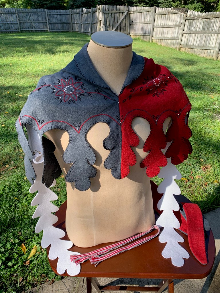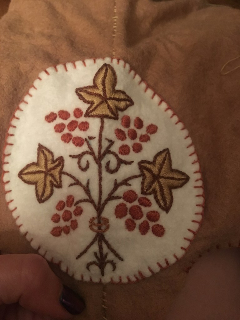 After working out some kinks in the pattern, I next went full force and began on a wool felt dagged hood with lots of embroidery and appliqué for Phelippe to wear to Bhakhail Yule two years ago.