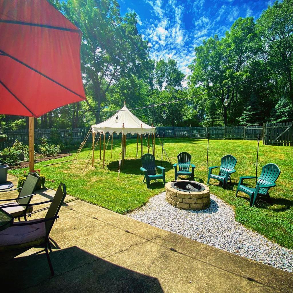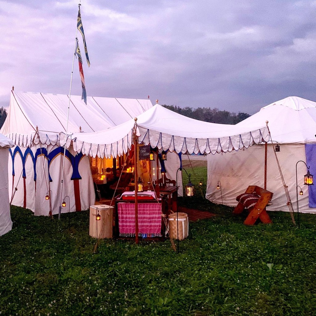 We still have our lovely encampment pictured below, but we have also managed to acquire a Panther Primitives 10′-0″ round pavilion (above). Our goal is to spruce it up a bit (I have so many painting and decorating ideas) and use it for smaller events. We’d also love to find someone to rent it from us for future Pennsics (we will deliver and setup)! I’ll be excited to share more pics of this ongoing renovation.